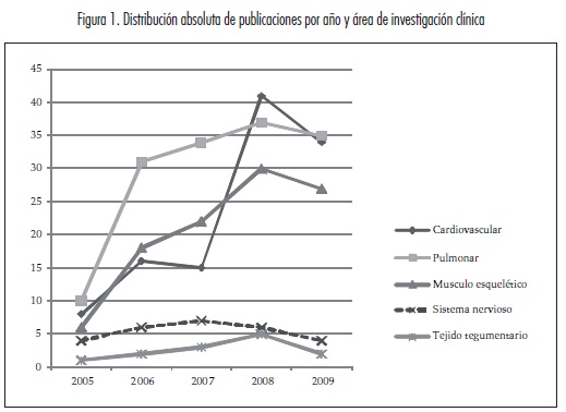 Las áreas clínicas pulmonar y cardiovascular concentran un 65% de las publicaciones científicas en los estudios analizados seguido de disfunción músculo esquelética. Los temas que registran un menor número de estudios incluyen las disfunciones en los sistemas nervioso y tegumentario. En las afiliaciones institucionales de los investigadores predomina el vínculo con universidades (52%) e instituciones de salud (31%). El análisis de los datos sugiere que las publicaciones en el área clínica de Fisioterapia han aumentado de manera significativa entre 2005 y 2009, siendo 2008 el año con mayor hallazgo de registros (119), sobre todo en el área cardiovascular (Figura 1).