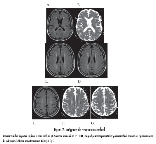 Al sexto día de hospitalización el paciente presentó otro episodio de déficit motor de hemicuerpo derecho, pero, en esta ocasión, con compromiso sensitivo ipsilateral que duró cuarenta minutos. Se decidió adicionar al régimen de anticoagulación acido-acetil salicílico, 100mg por día, y se repitió la resonancia magnética cerebral, la cual no mostró cambios con respecto a la previa (figura 2).