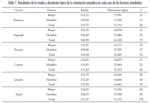 Los valores de empatía superiores en las mujeres observados en este trabajo, en relación con los hombres, independientemente de que las diferencias sean o no significativas desde el punto de vista estadístico, han sido fundamentadas por Retuerto, quien concluye que las mujeres "puntúan significativamente más que los varones en fantasía, preocupación empática y malestar personal" (28). Sin embargo, existen algunos trabajos en los cuales los hombres han obtenido mayores puntajes que las mujeres (9, 11, 14, 29).