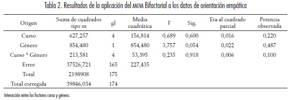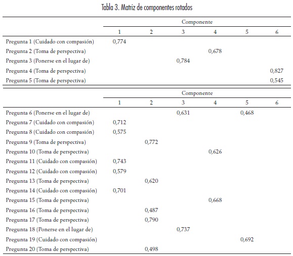 El valor de la media general de la variable estudiada fue de 111,07 con una desviación típica de la media de valor 15,133. Las medias de las sumatorias de los datos observados en todos los elementos, en cada sujeto analizado por curso y género, fluctuaron entre los valores de 104,68 y 114,75 (tabla 1) y no se observaron datos atípicos. Los resultados del ANOVA Bifactorial permitieron observar que ninguno de los factores estudiados resultó significativo (p > 0,05), lo que indica que no existen diferencias entre las medias de los cursos y entre los géneros estudiados. Se encontró que el estadígrafo η2 = 0,016 y η2 = 0,022 para curso, por una parte, y, por otra, se observó que la potencia para estos dos factores antes nombrados fue de 0,22 y 0,478. Lo anterior expone que el tamaño de muestra no es suficiente y que la probabilidad de cometer el error de tipo ii es relativamente alta. Los resultados de la estimación del estadígrafo KMO fue de 0,811, este se sitúa entre la clasificación de buena (0,80) y excelente (0,90), y la prueba de esfericidad de Bartlett fue altamente significativa (χ2=990,301; p < 0,0005), lo que indica que no se está en presencia de una matriz de identidad, lo que demuestra que el análisis factorial de componentes principales puede ser aplicada (tabla 2). Se han extraído seis factores de la escala aplicada para un total de 62,884% de varianza explicada por estos. Los factores son los resultantes con autovalores mayores que 1,0, y se expone el valor de la carga que tiene cada una de las preguntas. El resto de la varianza (37,116%) es un indicador de que la empatía está influida por otros factores no considerados en este estudio. Se observaron seis factores donde "la toma de perspectiva" se distribuyó en los factores 2, 4 y 6. El "cuidado con compasión" cargó a los factores 1 y 5. Finalmente, dos preguntas asociadas con "ponerse en los zapatos del paciente" cargaron solamente en el factor 3. En general, es posible señalar que cada uno de los conceptos esenciales de la empatía se asocian con factores bien definidos, aunque algunas de las preguntas puedan situarse en diferentes factores (tabla 3).
