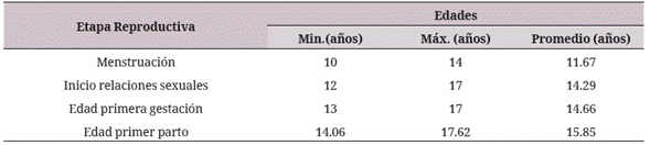 Las experiencias, decisiones y percepciones personales alrededor de los ciclos reproductivos de las adolescentes: menarca, inicio de relaciones sexuales, entrada a la unión, primera gestación, primer parto, lactancia y limitación del número de hijos son fundamentales para comprender la SSR de las adolescentes, ya que en estas etapas las jóvenes se enfrentan sea a cambios fisiológicos o a decisiones que pueden repercutir significativamente en su vida sexual y reproductiva. En la tabla 1 se pueden observar las edades en las que las 23 jóvenes entrevistadas viven sus etapas reproductivas.