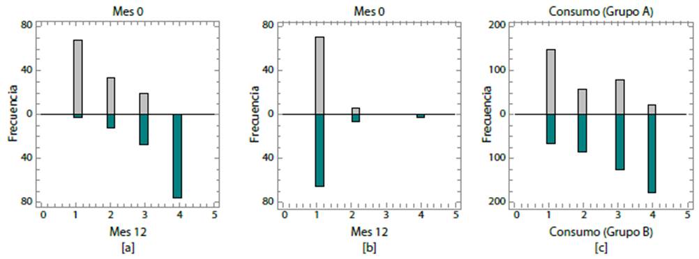 Figura 2 Histogramas de frecuencia para la frecuencia de tratamiento farmacológico: a) B: mes 0 vs. mes 12; b) A: mes 0 vs. mes 12; c) A vs. B