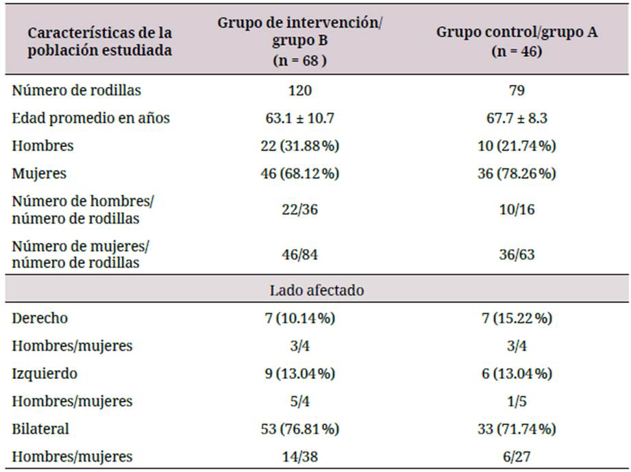 En la tabla 1 se presenta una caracterización de la población estudiada. Se aprecia el pre dominio de las mujeres, comportamiento que coincide con el de Cruz-Sánchez et al., que lo atribuye a que las mujeres son más propensas a la afección degenerativa, debido a fac tores hormonales y por la osteoporosis más temprana 12. Se observó la presencia mayoritaria de la afectación en ambas rodillas, tanto para el grupo control como para el grupo de intervención. La edad promedio en el grupo control fue ligeramente superior a la de los miembros del grupo de intervención, para un nivel de significación de 0.05.