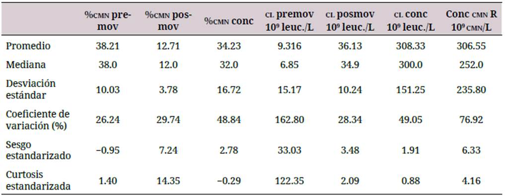 En la tabla 2 se reportan los estadígrafos para las variables estudiadas en el grupo B. Se comprobó que todas, excepto el porcentaje de células madre mononucleares antes de la movilización (media = 38.21; desviación estándar = 10.03) y el contenido de leucocitos en el concentrado (media = 308.33 x 109 leucocitos/L; desviación estándar = 151.25 x 109 leucocitos/L), no cumplían con una distribución normal. De ahí los altos valores de sesgo y curtosis estandarizados que se obtienen para las variables %CMN posmov, CL premov, CL posmov, % CMN conc y Conc. CMN R.