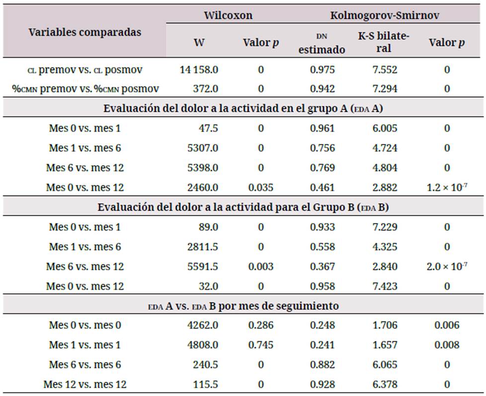 La confirmación de las apreciaciones comentadas se presenta en la tabla 5, que muestra el resultado de la aplicación de las pruebas de Wilcoxon y Kolmogorov-Smirnov, para las variables contenido de leucocitos y porcentaje de CMN, antes de la movilización con filgrastim (premov y posmov) y después de esta para el caso del tratamiento del grupo B. También se presentan los resultados obtenidos de la EDA en el grupo A y en el grupo B, de acuerdo con el tiempo de seguimiento y la comparación para un mismo tiempo entre los resultados de ambos tratamientos.