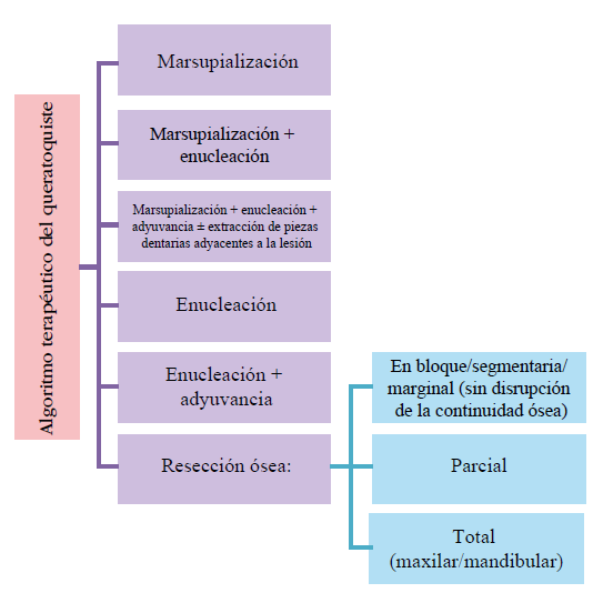 El tratamiento del QR resulta ser controversial, debido a su recidiva; sin embargo, entre las alternativas están incluidas: enucleación simple, curetaje y marsupialización o resección en bloque o completa del hueso; también se utilizan tratamientos coadyuvantes, como el curetaje químico con la solución de Carnoy (sc), crioterapia y ostectomía periférica. La elección de cada técnica depende del caso particular de cada paciente. Cuando se plantea este procedimiento, se conservan los dientes asociados a la lesión pero que no estén afectados 11.
