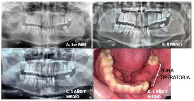 Figura 4 Seguimiento. A) A un mes. B) A los 8 meses. C) Al año y medio. D) Regeneración ósea al año y medio