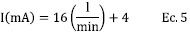Para esta investigación se implementó un transmisor electrónico calibrado para trabajar con alcance de 0 a 1 L/min con una salida de 4 a 20 mA. Ver figura 4. A partir de una ecuación punto-pendiente se obtiene la función del transmisor. Ver ecuación 5.