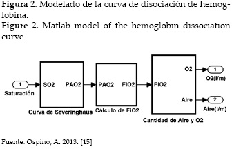 Una vez se validaron los datos, se procedió a implementar en Simulink un sistema llamado "Modelo Matemático Curva de Severinghaus" que contiene los subsistemas de la curva de Severinghaus, cálculo de FIO2 y cantidad de aire y O2 a partir de los diferentes modelos obtenidos en la investigación. Ver figura 2.