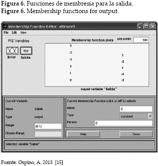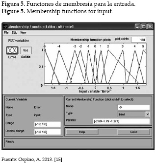 Los conjuntos son: cuando el error es muy negativo, cuando es negativo, cuando es cero, cuando es positivo y cuando es muy positivo. En la figura 5 se muestran las funciones de membresía para la primera entrada del sistema de inferencia difuso con sus respectivos rangos.
