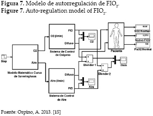 En la figura 7 se muestra el sistema de lazo cerrado de autorregulación de FIO2 que se implementó en Matlab, en el cual se muestran los subsistemas para el modelo matemático de la curva de Severinghaus, para el sistema de control de oxígeno y para el sistema de control de aire.