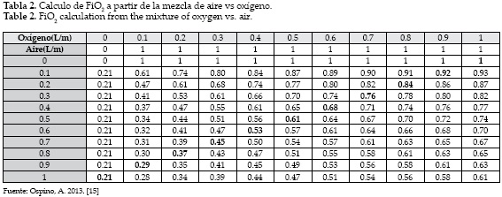 En la tabla 2 se muestra una relación de aire vs oxígeno que entrega el FiO2, que para el caso del presente proyecto debe mantenerse en un litro por minuto (1 L/min), en virtud que este es el flujo deseado para las cánulas nasales o sistemas de bajo flujo.
