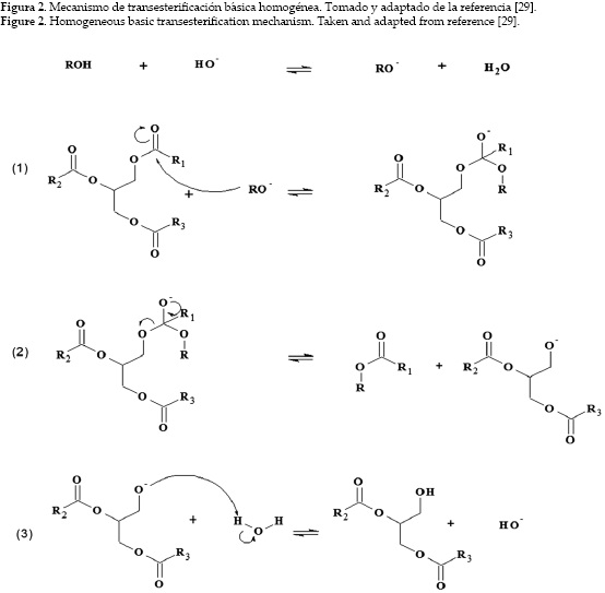 El mecanismo de la reacción de transesterificación por catálisis heterogénea tiene principios similares a los establecidos en la catálisis homogénea de sistemas ácidos o básicos [27], el cual se fundamenta en las características nucleofílicas y electrofílicas del grupo carbonilo de los triacilglicéridos y del alcohol. En la catálisis homogénea básica el factor importante es producir un alcóxido nucleofílico a partir del alcohol (ver figura 2) que luego ataque la parte electrofílica del grupo carbonilo [28]. La ruptura de los triglicéridos requiere de tres pasos: en el primero, se forma un intermediario tetraédrico debido al ataque nucloefílico del alcóxido al carbono electrofílico del grupo carbonilo. En el segundo paso, el intermediario se descompone formando un ion diacilglicérido y el éster alquílico del ácido graso. En el último paso se recupera el catalizador por transferencia de un protón. Estos pasos se repiten hasta formar los tres ésteres de ácidos grasos y glicerina [21]. En catálisis ácida homogénea, inicialmente el grupo carbonilo del triglicérido se protona por acción del catalizador ácido, luego sufre el ataque del alcohol formando un intermediario tetraédrico inestable que se descompone en el éster del ácido graso y el ion diacilglicérido. A diferencia de la catálisis básica, el átomo de carbono del grupo carbonilo de los triacilglicéridos se vuelve más electrofílico y más susceptible a ser atacado por el alcohol. Este proceso es más lento que el mecanismo básico. Esta importante diferencia en el mecanismo hace que los procesos tengan lugar a través de distintas velocidades de reacción [27].