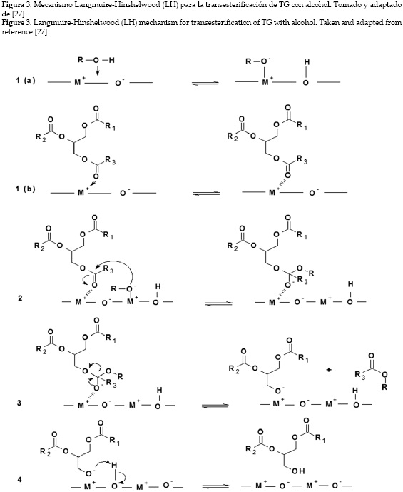 Con respecto a la catálisis heterogénea ácida en reacciones de transesterificación, se han propuesto dos hipótesis sobre el mecanismo de reacción: mecanismo de un solo sitio (tipo Eley-Rideal (ER)) o de doble sitio (modelo de Langmuir-Hinshelwood (LH)) [30-32]. En el mecanismo de reacción de un solo sitio, un carbonilo del triacilglicérido se adsorbe en el sitio activo del catalizador y luego es atacado por el alcohol en la fase líquida. El mecanismo del doble sitio sugiere que los dos reactantes (triacilglicérido y alcohol) se adsorben en sitios activos del catalizador, de manera que la reacción ocurre con las dos especies adsorbidas. El modelo LH para la transesterificación de acetato de etilo con metanol empleando óxido de magnesio como catalizador fue estudiada por Dossin et al. [32]. Ambos reactivos son adsorbidos por dos sitios del catalizador y luego reaccionan. La figura 3 muestra que el modelo LH describe la reacción de transesterificación básica. El mecanismo tiene cuatro pasos importantes. El primer paso 1(a) y 1(b) consiste en la adsorción de ambos reactantes en la superficie del catalizador. En el segundo paso (2) se produce un intermediario tetraédrico a partir del grupo alcóxido. Un éster del ácido graso se produce en el tercer paso y un diacilglicérido es el producto en el último paso.