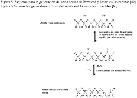 La actividad catalítica de las zeolitas descationizadas se atribuye a la presencia de los sitios acidícos debidos a las unidades tetraédricas de [AlO4] en el armazón. Estos sitios ácidos pueden tener carácter tipo Brønsted o Lewis. Las zeolitas sintetizadas normalmente casi siempre tienen iones Na+ que equilibran las cargas del armazón, pero se pueden intercambiar fácilmente por protones mediante la reacción directa con un ácido, produciendo grupos hidroxilo superficiales: los sitios de Brønsted. Como alternativa, si la zeolita no es estable en disolución ácida, es muy común formar la sal de amonio, NH4+, y luego calentarla para que el amoniaco se desprenda, dejando un protón. Un calentamiento posterior elimina el agua de los sitios Brønsted, quedando un ion de Al tricoordinado que tiene propiedades de aceptor de par de electrones; este se identifica como sitio ácido de Lewis. Un esquema de la formación de estos sitios puede verse en la figura 5. Por consiguiente, las zeolitas pueden presentar sitios ácidos de Brønsted o de Lewis, o ambos dependiendo de cómo se prepare la zeolita [60].