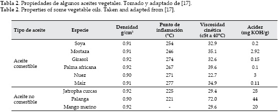 Químicamente, el biodiesel es una mezcla de ésteres de alquilo (metilo, etilo, ...) que contienen largas cadenas de ácidos grasos obtenidos típicamente a partir de recursos biológicos no tóxicos, tales como los aceites vegetales [17, 18], las grasas animales [19, 20] e incluso aceite de cocina usado [21]. La tabla 2 muestra algunas materias primas utilizadas en la producción de biodiesel y sus propiedades fisicoquímicas.