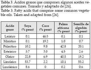 Con el fin de superar estos inconvenientes, muchos investigadores están interesados en los aceites no comestibles que no son adecuados para el consumo humano debido a la presencia de algunos componentes tóxicos en los aceites. Además, pueden cultivarse en terrenos no adecuados para el cultivo de alimentos, que no necesitan gran atención [23]. Sin embargo, la mayoría de aceites no comestibles tienen un alto contenido de ácidos grasos libres. Así que pueden requerir de pasos químicos adicionales, lo que aumentará los costos de producción [24, 25]. Las grasas animales tienen un contenido de grasas saturadas mayor al de los ácidos grasos y generalmente son sólidas a temperatura ambiente, lo cual puede causar problemas en el sistema de producción [17]. Los aceites de cocina usados no son aptos para el consumo humano, pero son una alternativa para la producción de biodiesel. La calidad de estos aceites preocupa por el alto contenido de impurezas, además que sus propiedades fisicoquímicas dependen del tipo de aceite. La tabla 3 muestra la composición de algunos aceites vegetales importantes.