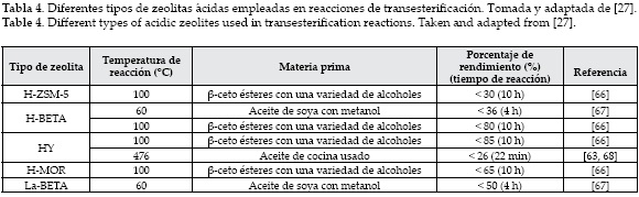 Las zeolitas como catalizadores son muy útiles porque ofrecen un área superficial interna considerable, además son cristalinas y por tanto pueden prepararse con un alto grado de reproducibilidad [60]. Sin embargo su actividad catalítica en las reacciones de transesterificación es relativamente baja (ver tabla 4). Esto se debe principalmente a la limitación de la difusión de los reactivos voluminosos (triglicéridos) en la estructura microporosa de la zeolita [33].