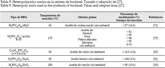 Los heteropoliácidos (HPAs) son ácidos complejos formados a partir de heteropolianiones que tienen como unidad básica octaedros metal-oxígeno. Los tipos Keggin (ver figura 6) son los principalmente usados en el diseño de una variedad de catalizadores ácidos. Las fórmulas generales de las clases de HPAs son: H8-XXxMVI12O40 y H8-x+nXxMVI12-nVVnO40 donde Xx=SiIV,GeIV,PV y AsV y M = MoVI y WVI . En los últimos años se han sintetizado nuevos HPAs por sustitución de Xx = TiIV, ZrIV y ThV. Además de ser considerados ácidos fuertes de Brønsted e inclusive acercarse a la categoría de superácidos, los HPAs han demostrado ser muy estables a altas temperaturas, presentan buenas propiedades mecánicas, facilidad en el manejo, son reutilizables, benignos con el medio ambiente y económicamente factibles. Pero presentan algunos inconvenientes relacionados con su baja área superficial, baja porosidad y dificultades en la recuperación [27]. Los HPAs tipo Keggin, a pesar de ser catalizadores sólidos empleados en reacciones en fase gaseosa, presentan alta solubilidad en medios polares como el agua y metanol, razón por la cual, en la metanólisis del aceite de colza, los heteropoliácidos (H3PW12O40, H4SiW12O40 y H3PMo12O40) actúan como catalizadores homogéneos con un desempeño mayor que los ácidos minerales (H2SO4 y H3PO4). Sin embargo publicaciones recientes han demostrado que heteropoliácidos (H3PW12 y H3PMo12O40) soportados sobre arcilla ácida K-10 mostraron alta eficiencia y estabilidad [76]. Por otro lado, la adición de una relación apropiada de cationes monovalentes (Cs+, NH4+ y Ag+) aumentó significativamente el área superficial, lo cual permitió mayor accesibilidad de los reactivos a los sitios activos [76, 77]. Un resumen sobre el rendimiento de HPAs y condiciones de reacción empleando diferentes materias primas para la producción de biodiesel a partir de aceites vegetales se muestra en la tabla 5.