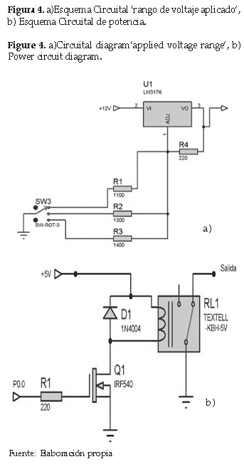 Para manipular los voltajes que alimentan la válvula de carga Sol A y la válvula de descarga Sol B se diseñó un circuito con LM317[18]que modifica el voltaje de una fuente regulada de 12 V dc, ver figura 4a. Para seleccionar el voltaje que alimenta las válvulas Sol A o Sol B, se diseñó un circuito de potencia basado en relé electromecánico para Sol C, ver figura 4b. Los anteriores diseños conforman la Tarjeta de control y potencia, ver figura 5a.
