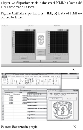 El ensayo finaliza cuando la probeta se rompe y el HMI indica el valor pico de carga y el desplazamiento durante el ensayo, posteriormente presenta las gráficas finales de carga y desplazamiento vs tiempo, con opciones de: guardar datos, guardar video, exportar datos a Excel o simplemente salir del ensayo, ver figura 7a. En caso de exportar a Excel aparecen: datos, gráfica final del ensayo y una ficha técnica del mismo, ver figura 7b.
