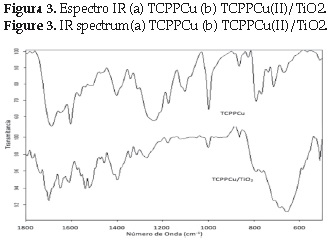 Los espectros de absorción (1800-1000 cm-1) de la TCPP-Cu y TCPPCu /TiO2 se muestran en la figura 3. Para la porfirina, la banda característica del grupo ácido carboxílico, ν(C=O), se observa en torno a 1701 cm-1. Los modos de tensión C-O se observan en 1225 cm-1 y 1268 cm-1. Debido a que la TCPPCu puede adsorberse a la superficie del TiO2 a través de los ácidos carboxílicos, se observó una disminución significativa en la intensidad de las bandas correspondientes a los grupos carboxilato. El espectro de la porfirina adsorbida muestra la presencia de las bandas asimétrica y simétrica de los grupos carboxilato: en 1650 cm-1ν(-COOas-) y en 1381 cm-1ν(-COOs-). Estos resultados permiten indicar que probablemente la porfirina se encuentra anclada a través de un enlace carboxilato sobre la superficie del TiO2.