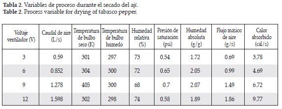 los datos experimentales, se determinó que la temperatura más adecuada para realizar el secado del ají tabasco era 50 °C, debido a que, para las temperaturas de 40 y 45 °C, el proceso transcurre lentamente, por lo cual la inversión de tiempo y el consumo de energía es mayor, comparado con las muestras deshidratadas a temperaturas más elevadas. Los procesos con temperaturas de 60, 65 y 70 °C, produjeron cambios en el color del producto final y en la textura de la muestra, debido a las variaciones del secado de la superficie, la cual no era uniforme, además era necesario realizar un mayor control del proceso para mantener la temperatura constante, debido a que la fuente de calor se recalienta y se producen variaciones en la temperatura del flujo del aire.