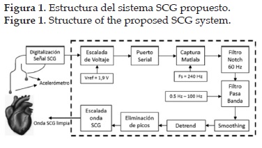 El presente trabajo muestra el desarrollo de un sistema basado en acelerometría, para la captación y análisis en Matlab, de señales precordiales usando sismocardiografía (SCG). La SCG es un método eficaz para captar las señales en el área precordial de forma no invasiva. El proyecto se dividió en tres fases: la primera tuvo de objeto la selección del acelerómetro, la tarjeta de adquisición de datos (DAQ) y la interfaz de comunicación entre el acelerómetro y el DAQ; la fase 2 incluye la digitalización de la señal, y por último la tercera fase llevó a cabo el tratamiento digital de la señal SCG para su correcta visualización además de la detección los eventos cardíacos. Se tomaron las vibraciones precordiales usando un sensor inercial (acelerómetro) con un rango de medición de ± 1.5 g, luego se digitalizó la señal análoga por medio del DAQ (Arduino Uno) para ser enviada al entorno de Matlab, encargado de procesar con filtros digitales pasa banda, eliminación de picos, smoothing (suavizado) y eliminación de tendencias no lineales. De las pruebas realizadas, el sismocardiógrafo como dispositivo biomédico para medir la actividad cardíaca, se presenta como una gran opción en la detección de anomalías de forma prematura, como también en la ayuda de terapias de resincronización cardíaca, problemas coronarios y afecciones crónicas del corazón, entre otros. En las mediciones de prueba se demostró la capacidad del sistema para identificar información cardiovascular correspondiente a 9 eventos cardíacos.