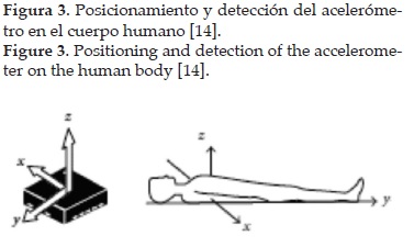 Este estudio se desarrolló en la Universidad Autónoma del Caribe (UAC) por el Grupo de Investigación en Ingeniería Mecatrónica (GIIM). El sistema estuvo conformado por un: acelerómetro encargado de medir las vibraciones en el área precordial de la persona, una interfaz de conexión entre el acelerómetro y el computador (tarjeta de adquisición de datos) y por último el sistema de procesamiento encargado de analizar la señal fiable con respecto a la bibliografía. La figura 3 muestra la aceleración en los ejes y, x y z, donde tenemos el elemento longitudinal (superior-inferior), elemento lateral (medial-lateral) y elemento sagital (dorso-ventral), respectivamente.