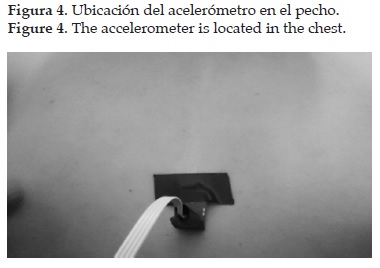 El sensor de SCG fue colocado en la línea media del cuerpo del esternón con el extremo inferior del sensor en el extremo superior de la apófisis xifoides. En la medición del SCG se usó cinta doble faz para asegurar el contacto entre el acelerómetro y la piel, esta no necesita depilación. Se tuvo especial cuidado en la correcta ubicación del sensor para que la señal registrada mostrara una amplitud suficiente para interpretar los datos registrados, esto en referencia con la bibliografía y estudios clínicos previos. La figura 4 muestra el montaje del sensor con respecto a un plano espacial para la medición correcta de la señal SCG.