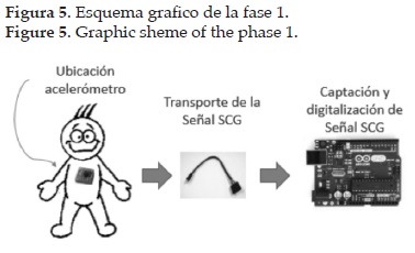 El proyecto se desarrolló en tres fases; la primera fue la selección del sensor inercial (acelerómetro), la tarjeta de adquisición de datos (DAQ) para el tratamiento digital de la señal y por último la interfaz de comunicación entre el acelerómetro y el DAQ. Se seleccionó el acelerómetro ADXL 335B de analog devices como sensor inercial y el Arduino Uno como DAQ. La figura 5 explica de manera gráfica desde la ubicación del acelerómetro hasta la captación y digitalización de la señal.