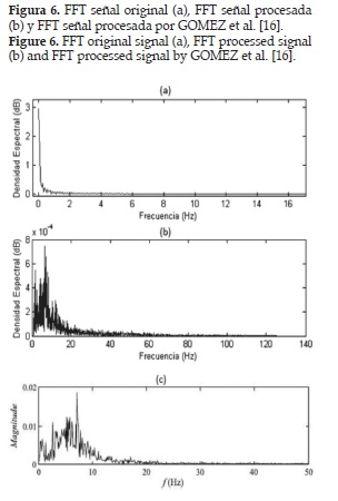 A la Fase 2 le compete la digitalización de la señal con una frecuencia de muestreo de 240 Hz, la cual es óptima para evitar el fenómeno de aliasing; según el criterio de Nyquist la frecuencia de muestreo debe ser de por lo menos el doble de la frecuencia máxima de la señal a muestrear [15]. El rango de frecuencias de la onda SCG es de 0.5 a 100 Hz, la figura 6 muestra el resultado de un análisis espectral por medio de la transformada rápida de Fourier de la señal sin procesar vs la señal procesada digitalmente. En la figura 6 (b) se puede apreciar el rango de frecuencias que poseen mayor densidad espectral, dependiendo a este análisis se tomaron acciones de filtrado. Para evitar el aliasing se debe muestrear mínimo a 200 Hz y la figura 6 (c) es la FFT realizada en otro estudio [16], la cual permite contrastar la similitud entre estas dos.