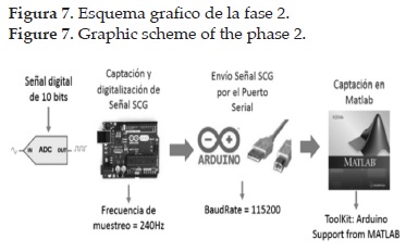 En esta etapa también tuvo como objetivo el envío de la señal SCG a Matlab donde se usó el puerto serial del Arduino. La figura 7 muestra un breve esquema de la fase 2, donde se destaca la resolución de 10 bits para las señales muestreadas del Arduino y su Toolkit para la comunicación con Matlab.