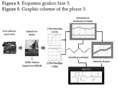 La última Fase incluyó el tratamiento digital de la señal SCG para su correcta visualización y para la detección de los eventos mencionados por Tavakolian Kouhyar [3]. El algoritmo empieza con la lectura por el puerto serial de la señal SCG digitalizada por el Arduino Uno, guardándola en un vector de N valores (N = número de muestras). A la Señal SCG se le aplicó un filtrado digital tipo FIR (Equiripple) pasa banda de octavo orden, la banda de paso estuvo entre 0.3-0.5 Hz y 80-100 Hz, con una atenuación de 100 y 80 dB en la banda de rechazo, respectivamente. Luego de obtener la señal filtrada se procedió a realizar un Smoothing (filtro) para eliminar los pequeños picos y obtener una onda más natural con menos ruido. En muchas de las señales biológicas se presenta un fenómeno de tendencia que puede ser lineal o lineal donde la señal no muestra un marco de referencia fijo. Para la señal obtenida, se usó un algoritmo que eliminó las tendencias no lineales y por último se realizó la eliminación de picos para presentar una señal más fiel. La figura 8 muestra el procesamiento digital realizado correspondiente a la Fase 3.