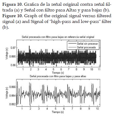 En este orden de ideas se vio la necesidad de eliminar el ruido producido por la inhalación y exhalación de aire; para ello la implementación de un filtro digital pasa altas con frecuencias de corte 0.1 Hz y frecuencia de paso 0.5 Hz, fue capaz de eliminar el componente que afecta la onda SCG final, además de ayudar al suavizado general. Para tal fin se realizó una convolución entre el Filtro Digital FIR (Finite Impulse Response) y la señal original. Asimismo se observó la necesidad de un filtrado pasa bajas para eliminar las frecuencias mayores de 100 Hz que en algún sentido pueden afectar la onda SCG. Al igual que el filtro pasa altas, se diseñó el filtro pasa bajas, con frecuencia de paso de 90 Hz y frecuencia de corte de 100 Hz, también se le realizó un filtro Notch de 60 Hz para eliminar el ruido ambiental que pudiese afectar la medición.