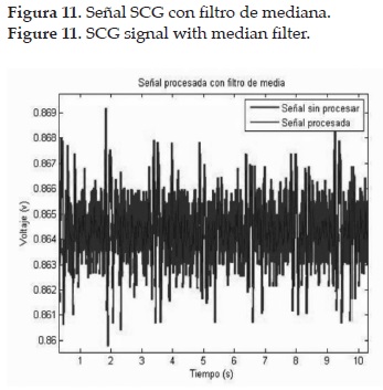 Inicialmente se implementó un filtro de mediana, el cual reemplaza cada punto de la señal SCG a evaluar por la mediana de ese punto y sus vecinos, definiendo un factor de expansión "n" se pueden elegir el número de puntos vecinos. Para el presente caso se eligió un factor de expansión de 5, la figura 11 muestra el resultado de un filtrado de mediana, la línea roja muestra la señal SCG solo con filtro pasa banda, mientras que la línea más delgada de color azul muestra el primer tratamiento robusto aplicado.