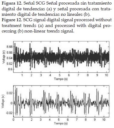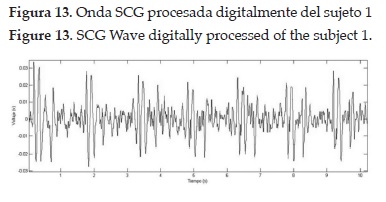 Este resultado se asemeja a los de RIENZO et al. [23] JEROSCH et al. [21] y PAUKKUNEN et al. [22] los cuales muestran señales SCG tratadas con filtros de smoothing y eliminación de tendencias no lineales (detrend). La figura 12 muestra claramente la señal SCG con el algoritmo para eliminar las tendencias no lineales, cabe destacar que son 10 segundos del ciclo cardiaco del sujeto 1, siguiendo el protocolo de medición.