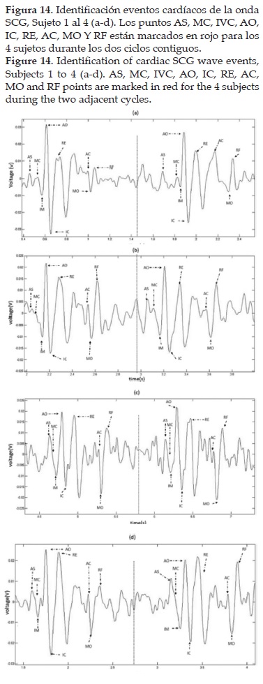 La figura 14 muestra la localización de los eventos cardíacos para los 4 sujetos, los puntos de apertura y cierre de la válvula mitral y aorta, son los de más importancia, ya que muchos estudios [1,2] revelan que la principal causa de muerte a nivel mundial es por enfermedades cardiovasculares. Estas afecciones se dividen en varios grupos, del cual, las muertes por problemas valvulares ocupan un gran porcentaje. La versatilidad del sistema se notó en la capacidad de recolectar esta información de forma rápida y eficaz. En el campo biomédico el desarrollo de un sistema integrado para captar las señales SCG es de gran relevancia.