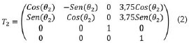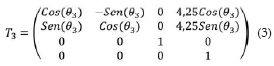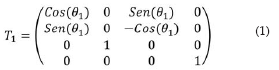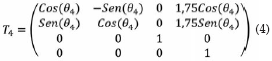Con base en los parámetros DH se obtuvieron las cuatro matrices de transformación homogénea tal como se indica en las ecuaciones 1 a 4, para definir la posición y orientación de cada uno de los eslabones del robot AL5A con respecto al eslabón inmediatamente anterior.