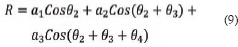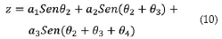 Para encontrar los valores de los ángulos de articulaciones restantes del robot, conociendo además las longitudes de cada eslabón, se consideró un sistema con las ecuaciones 8, 9 y 10, para solucionar las incógnitas 𝜃 2 , 𝜃 3 y 𝜃 4