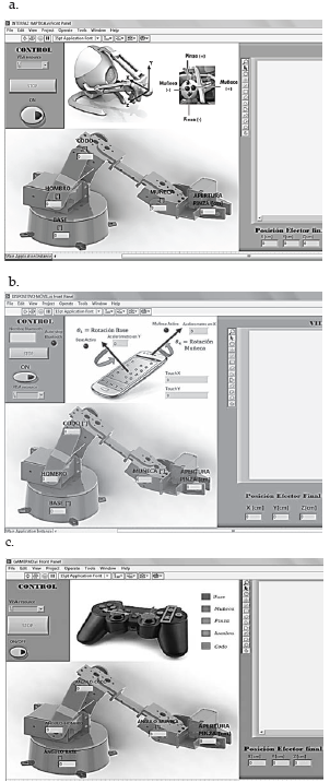 Figura 10 Interfaces de usuario generadas. a) Novint Falcon™. b) Telefono móvil. c) Control Joysctick.