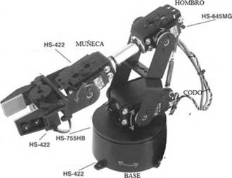 Es un mecanismo de configuración serial producido por Lynxmotion™ mediante un kit de ensamble. El robot indicado en la figura 3, cuenta con cuatro grados de libertad que permiten rotación de la base, movimiento de codo, giro de hombro, movimiento de la muñeca y adicionalmente incluye la apertura o cierre de una pinza como efector final. Sus actuadores son servomotores marca Hitec® con referencias HS422, HS755HB y HS645MG19.