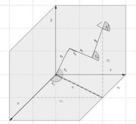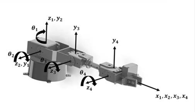 Para que un robot realizara una tarea específica de ubicación, se consideraron dos métodos para encontrar la posición del efector final, mediante un análisis de cinemática directa especificando los ángulos de cada eslabón y de cinemática inversa, indicando la posición y orientación del efector final, para encontrar los ángulos en los eslabones según se muestra en la figura 4, con xi, yi y zi las coordenadas del punto tomado como referencia para el eslabón i.