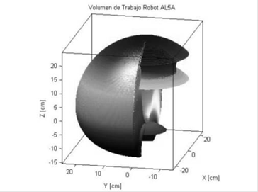 A través de un algoritmo de iteraciones en Matlab® se realizó un barrido de valores para los ángulos de acuerdo a los rangos establecidos en la tabla 1 con θ 1 correspondiente a movimiento de base, 𝜃 2 al hombro, 𝜃 3 al codo y 𝜃 4 a la muñeca del robot. Con lo cual se pudieron establecer las posibles posiciones de la pinza como efector final, mediante la aplicación de la matriz de transformación de la ecuación 5, considerando el volumen de trabajo del robot mostrado en la figura 5.