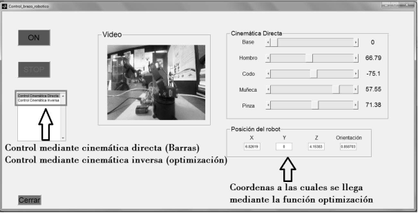 Tomando como bases las ecuaciones planteadas para el modelamiento cinemático del robot, se desarrolló una interfaz gráfica de usuario con Matlab® para el control por medio de barras deslizantes incluyendo dos funciones: cambio del ángulo de cada articulación por medio de un algoritmo de cinemática directa y espacios de ingreso de texto para definir posiciones especificas establecidas de la pinza considerada como el efector final del robot. La imagen principal de la interfaz desarrollada se encuentra en la figura 7. Se implementó una cámara para visualizar el entorno remoto y un entorno de realidad virtual para animar los desplazamientos del robot mediante la conversión de archivos de ensamble en SolidWooks (*.xml) en conjuntos geométricos a los cuales se les aplicaron transformaciones de desplazamientos y rotaciones definidas como entradas de cada eslabón conectado a un respectivo bloque de Simulink®.