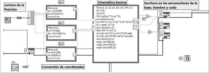 La interfaz háptica Novint Falcon™ permite leer la posición (x-y-z) del efector final en su espacio de trabajo y enviar esta información a LabVIEW™. Con estas coordenadas y mediante el análisis de cinemática inversa en el robot (ecuaciones 6 a 10), se controlan los eslabones de la base, el hombro y el codo considerando las transformaciones de acuerdo a los rangos máximos y mínimos del volumen de trabajo para el robot.