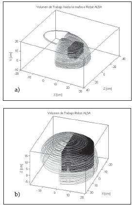 El volumen efectivo de desplazamiento con la interfaz se muestra en la figura 9a, en la cual se aprecia la intersección de su volumen de trabajo dentro del espacio efectivo de posicionamiento del robot, lo que permitió ubicar el efector final en cualquier posición dada por el dispositivo maestro.