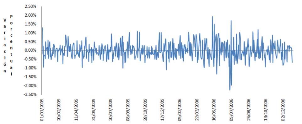En la Gráfica 2, se puede observar la variación de los movimientos en el tipo de cambio del año 2005 al año 2006. La mayor volatilidad se puede observar de mediados de mayo a mediados de julio de 2006.