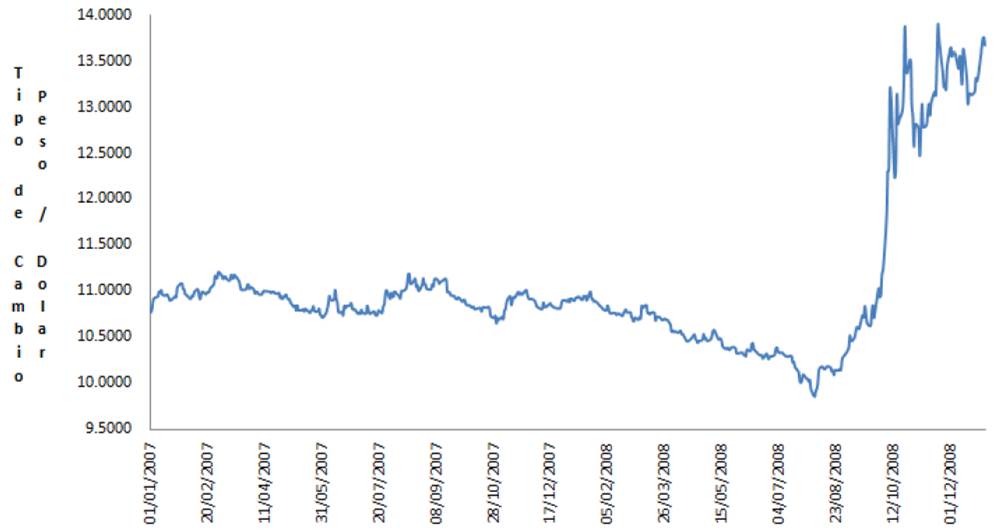 En México se ha observado a través de las décadas que uno de los principales indicadores económicos que incrementa su volatilidad en una crisis financiera es el tipo de cambio Peso/Dólar, debido a la gran correlación que existe entre la economía norteamericana y muchas empresas que, con sede en México, manejan operaciones, transacciones y pagos en dicha divisa. Derivado de lo anterior, todas las compañías que manejan flujos de efectivo futuros en dólares están expuestas a la posibilidad de sufrir pérdidas por la paridad del tipo de cambio, especialmente en una época de crisis el riesgo latente aumenta y se deben tener las medidas necesarias para hacer frente a las obligaciones contractuales futuras.