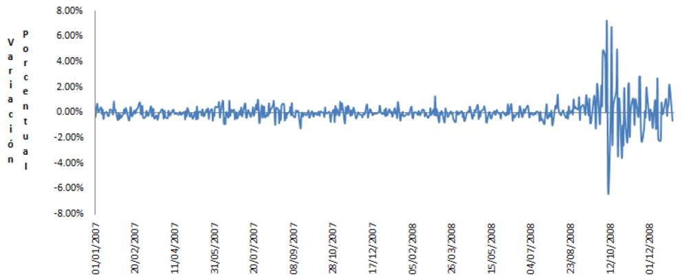 En la Gráfica 4, se puede observar la variación de los movimientos en el tipo de cambio del año 2007 al año 2008. Se observa que la volatilidad en el tipo de cambio en el mes de octubre de 2008 se incremente de forma exponencial y en un corto periodo se elevó el tipo de cambio de forma drástica.